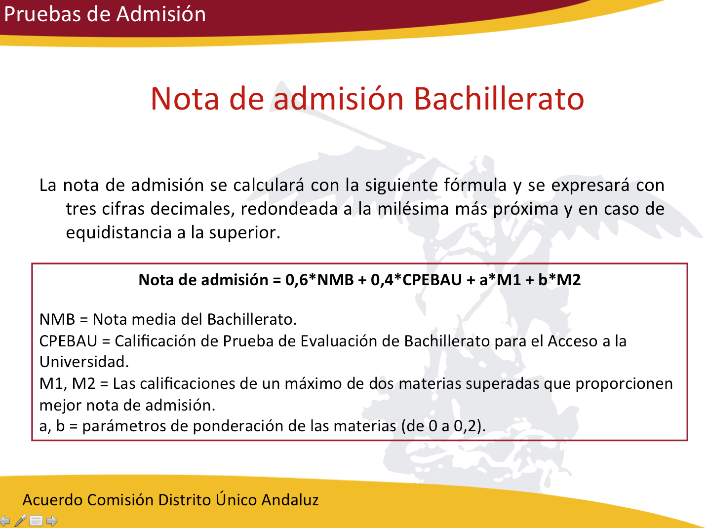EL Distrito Único Universitario de Andalucía establecen los parámetros de ponderación para el cálculo de la nota de admisión para el ingreso a las titulaciones de grado. En estos cuadros puedes conocer el valor que tiene para cada carrera universitaria las materias de 2º Bachillerato de las que te puedes examinar en la FASE DE ADMISIÓN. Puedes presentarte a cuatro de ellas (incluso si no la has cursado).
